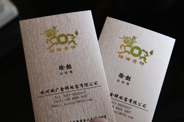 燙印效果華貴典雅,讓您的名片熠熠生輝,氣度非凡,燙印顏色包括金、銀、藍、黑、紅等加工價格依燙金面積大小而定,如果燙金的面積小于名片單面總面積的1/3,則每面每盒的加工價格為10元;如果大于單面總面積的1/3,則每面每盒的加工價格為20元。另加**次制版費15-20元。送貨時間3-5個工作日。