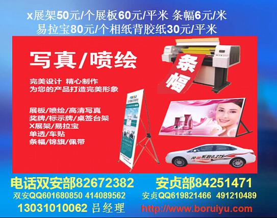我公司制作易拉寶、X展架、拉網、燈片、燈箱布、網格布、單透、高光相紙、掛軸、車帖等寫真噴繪產品,進口機器制作,質優價廉,歡迎惠顧!寫真輸出(燈片 全透片 海報背膠 相紙),噴繪輸出(網格布 燈布 車身貼),制作 易拉寶 X架 拉網展架 電腦刻字,KT板,大型活動,及各類展版噴繪,寫真,展板,展架,易拉寶,X展架,,廣告條幅。